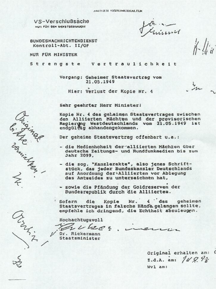 Geheimdienstliches Dokument über den Verlust eines Exemplars der sogenannten "Kanzlerakte"